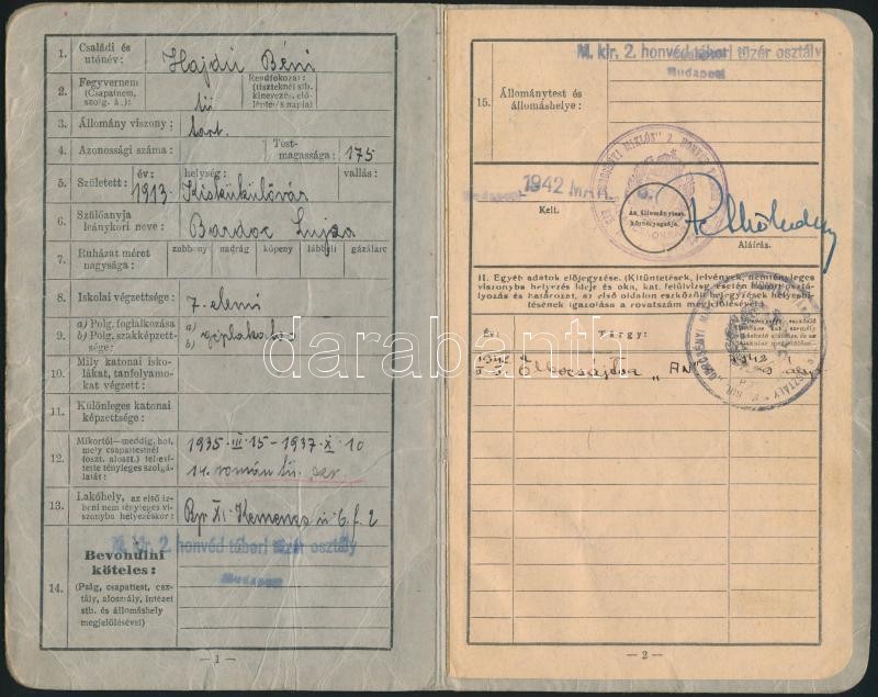 Leírás: 1935 Katonai igazolványi lap, bejegyzésekkel