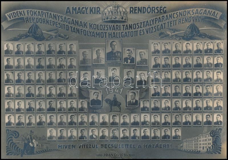 1941 A m. kir. rendőrség vidéki főkapitányságának kolozsvári tanosztályparancsnokságának végzett növendékei, tablófotó Joanovics utóda műterméből, 19,5×27,5 cm