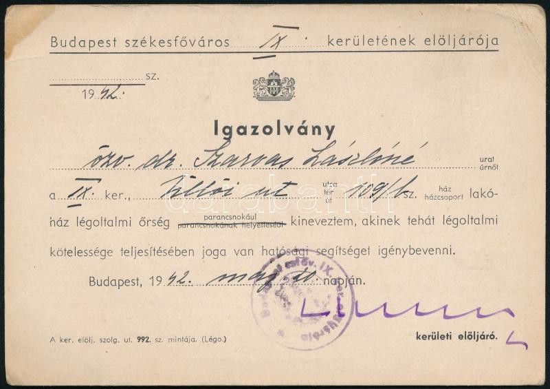 1942 Légoltalmi őrségparancsnoki igazolvány https://www.darabanth.com/hu/322-Gyorsarveres/322.0/Festmeny-mutargy-papirregiseg-egyeb/Militaria~500030/1942-Legoltalmi-orsegparancsnoki-igazolvany~II1785748