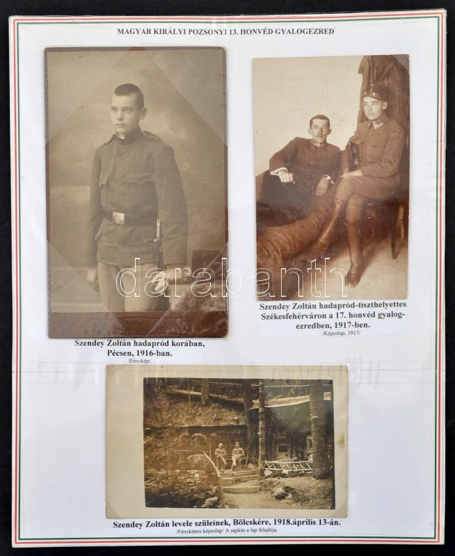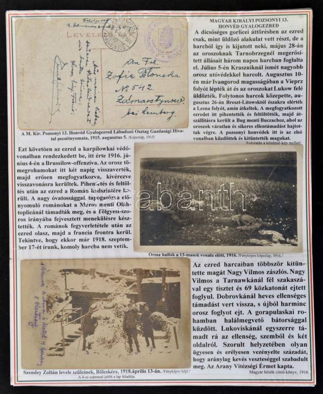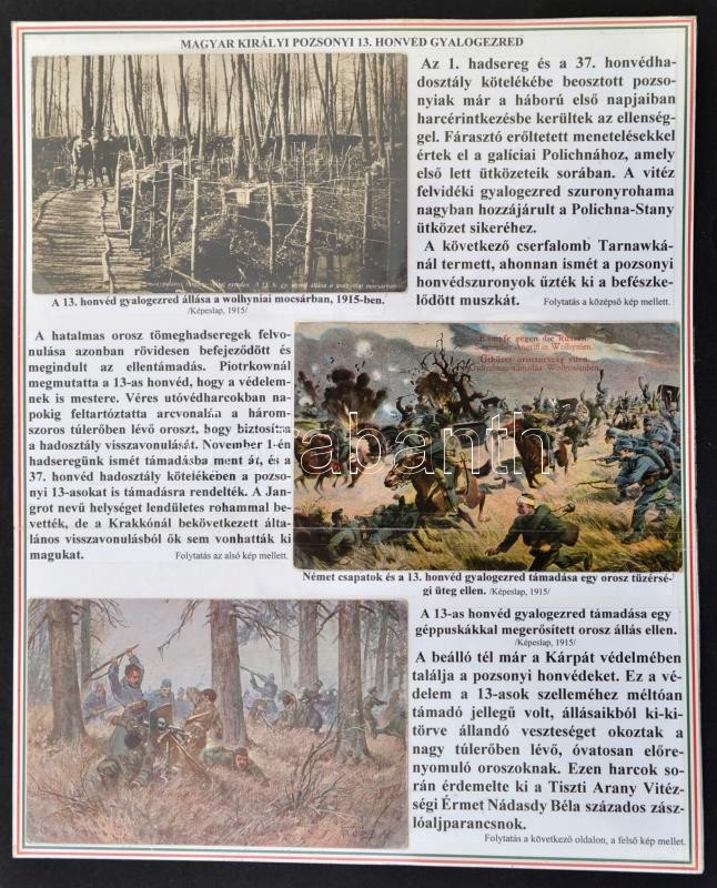 A magyar királyi 13. pozsonyi honvéd gyalogezred története. Különleges, egyedi összeállítás az első világháborús gyalogezredről, 4 nemzetiszín tablón részletes nyomtatott szöveggel, rajta 12 eredeti képeslappal (képeslapok, fotólapok 1915-1918), 1 eredeti fotóval (1916), rajtuk az ezred zászlósáról, Szendey Zoltánról készült számos fotóval, a képeslapok, fotók nincsenek felragasztva a tablókra./ / History of 13th Hungarian Royal Army Infantry Regiment of Bratislava (Pressburg, Posonium), with 12 pc. original postcards and one original photo, on 4 sheets, not glued on the paper.