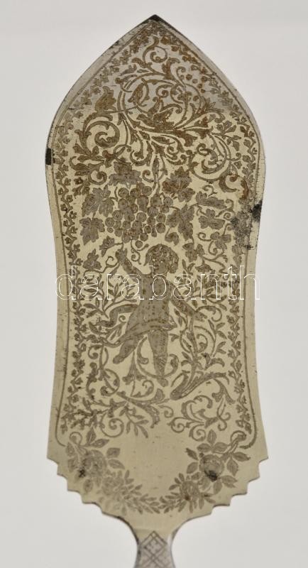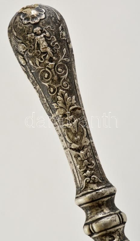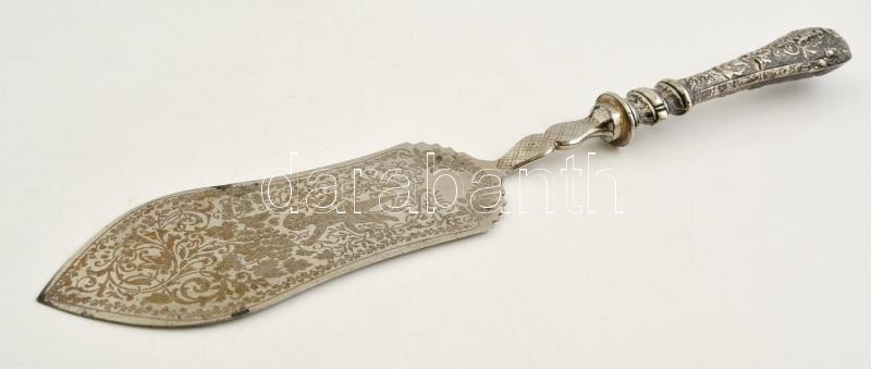 Leírás: Ezüst nyeles (Ag.) tortalapát, puttós díszítéssel, jelzett, mesterjeggyel (SE), a fogója tetején sérült, h:31 cm.