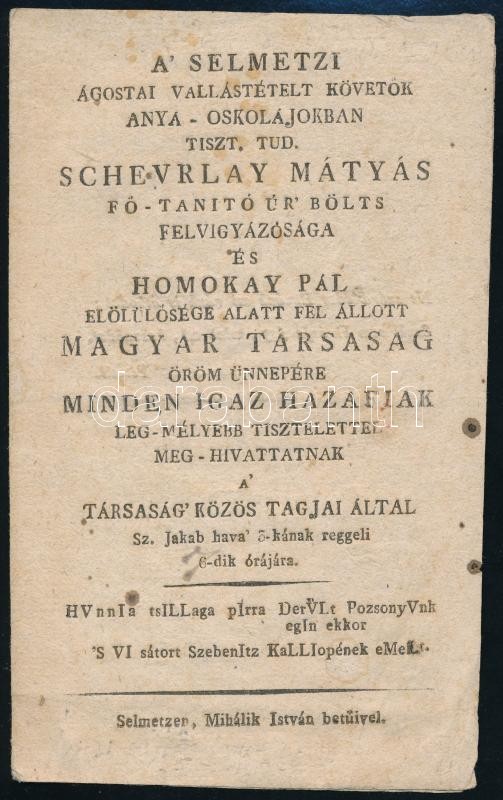 1827 2 db selmeci aprónyomtatvány (Selmecbánya, Mihálik István: A selmetzi magyar társaság öröm-ünnepe előtt és után éneklendő dall, mellyet Homokay Páltól szerezve négy hangra alkalmaztatott Platsko István. Kissé foltos, 4 p.; Meghívó a selmeci magyar társaság örömünnepére, programmal, kissé foltos, 4 p.