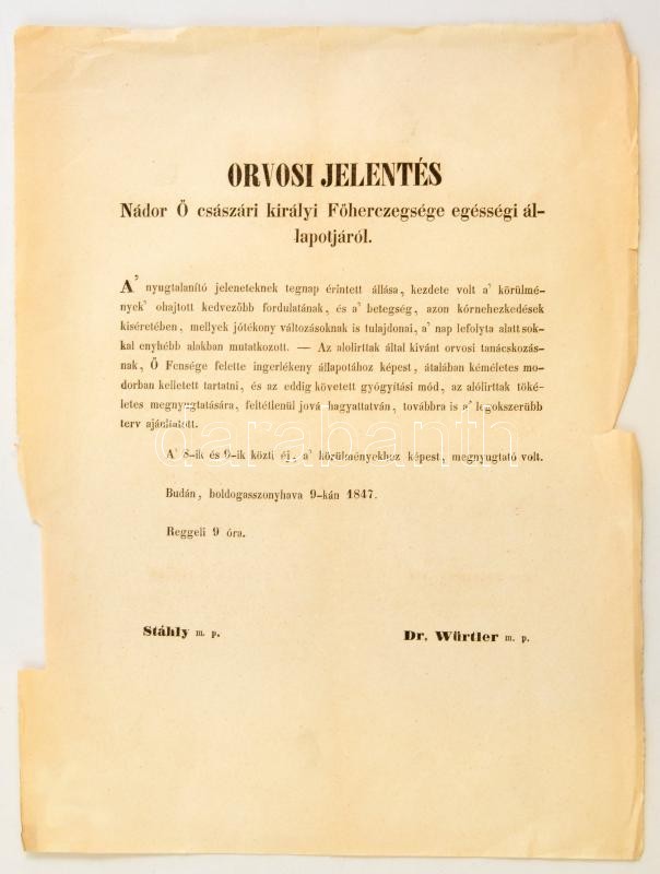 1847 "Orvosi jelentés nádor ő császári királyi főherczegsége egésségi állapotáról", Stáhly és Würtler kezelőorvosok január 9-i jelentése József nádor egészségi állapotáról, néhány nappal annak halála előtt, kis szakadással, aláírás nélkül