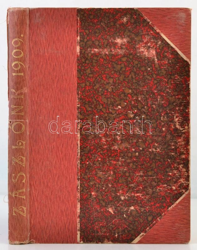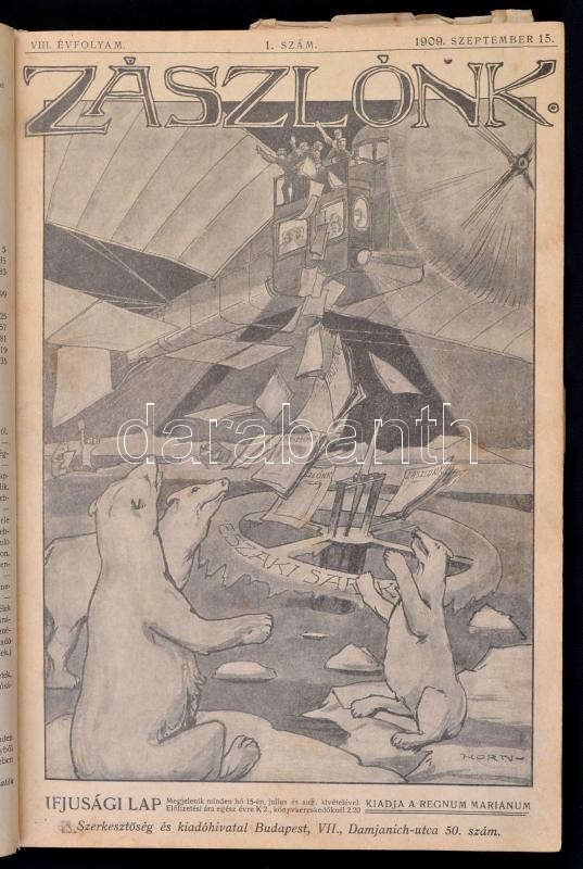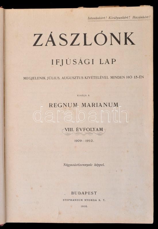 1909-1910 Zászlónk. 1909 szeptember-1910 június VIII. évf. 1-10. szám. Kiadja Regnum Marianum. Bp., Stephaneum-ny. Átkötött korabeli félvászon-kötés, sérült gerinccel, 59/60. oldal hiányzik, 61/62.-83/84. oldal szakadt, és kijár, az eredeti borítókat bekötötték.