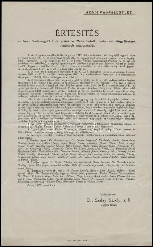 Leírás: 1919 az Aradi Vadászegylet értesítője a június 28-i közgyűlés határozatairól