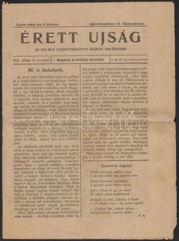 1921 Az Érett Újság 1. száma (és egyben utolsó), a sátoraljaújhelyi rk... https://www.darabanth.com/hu/322-Gyorsarveres/322.0/Festmeny-mutargy-papirregiseg-egyeb/Nyomtatvanyok~500032/1921-Az-Erett-Ujsag-1-szama-es-egyben-utolso-a-satoraljaujhelyi-rk-fogimnazium-1921-b~II1785820