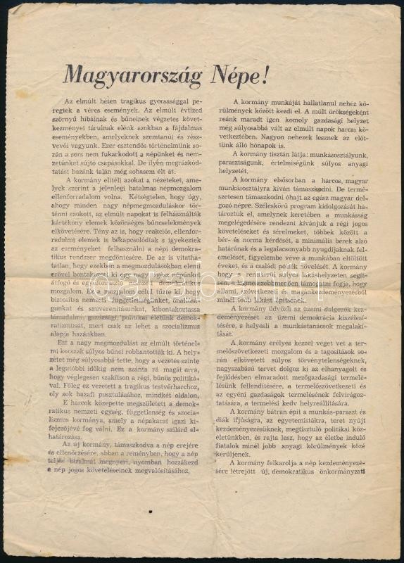 Leírás: 1956 A Magyar Dolgozók Pártja Központi Vezetőségének felhívása a magyar néphez, röplap
