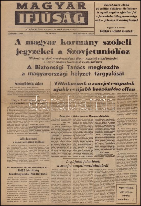 1956 Magyar Ifjúság, I. évf. 3. szám. 1956. november 3., 4 p. https://www.darabanth.com/hu/322-Gyorsarveres/322.0/Festmeny-mutargy-papirregiseg-egyeb/Nyomtatvanyok~500032/1956-Magyar-Ifjusag-I-evf-3-szam-1956-november-3-4-p~II1784445