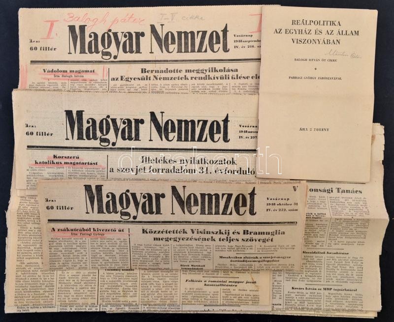 Balogh István: Reálpolitika az egyház és az állam viszonyában. Balogh István öt cikke. Parragi György zárószavával. Bp.,é.n.,Hungária Hírlapnyomda Rt., 29 p.+ Cikk gyűjtemény a Magyar Nemzet 1948-as számából, benne többségében Balogh István írással, valamint egy Parragi György írással.