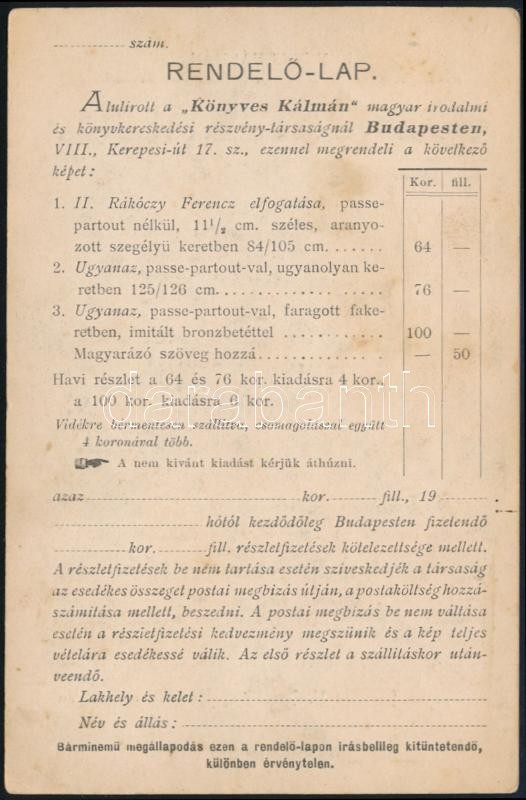 Leírás: cca 1900 Rendelőlap a Könyves Kálmán Irodalmi Intézet kiadványaihoz, pl az előlapon található Rákóczi képhez. Képeslap méretben