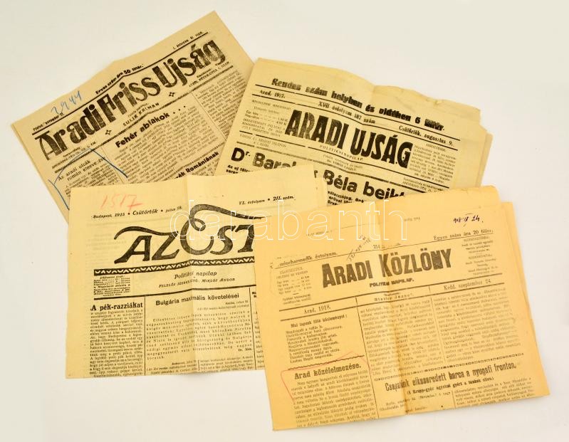Leírás: cca 1915-1919 4 db főleg aradi újság egy-egy lapszáma: Aradi Friss Újság, Aradi Közlöny, Aradi Ujság, Az Est