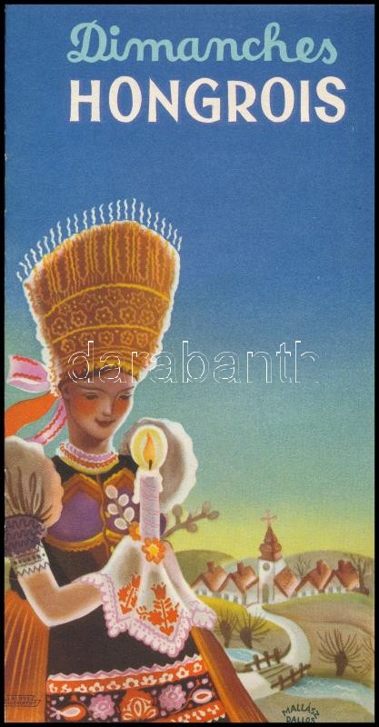 cca 1930 Dimanches Hongrois. Francia nyelvű turisztikai prospektus Magyarországról. Mallász Gitta (1907-1992) és Dallos Hanna (1907-1944) népies stílusú színes illusztrációval, fekete-fehér fotókkal illusztrálva. Bp., é.n, Klösz, 6 p.