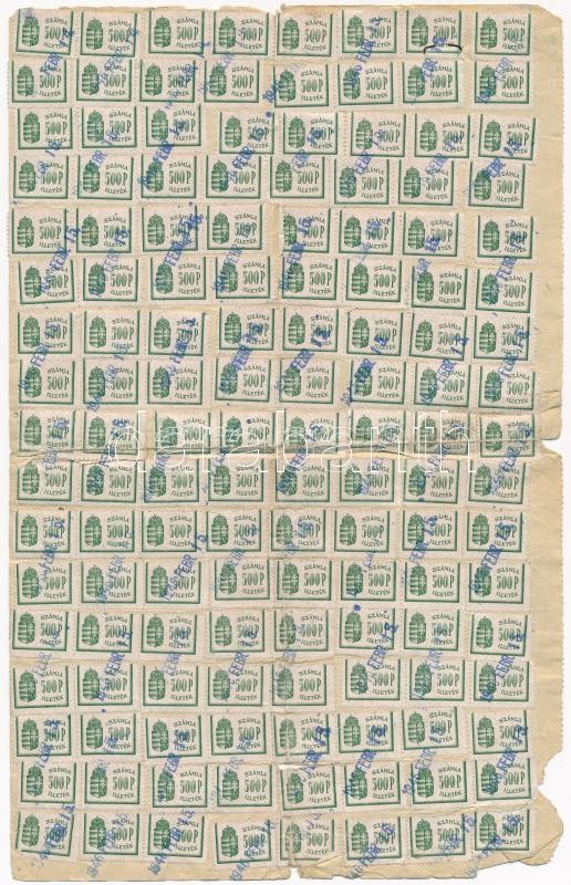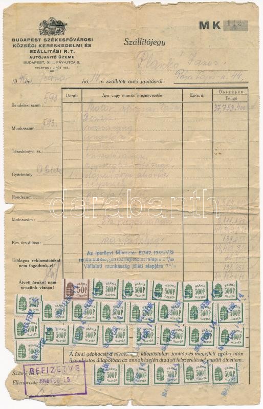 1945 Budapesti Székesfővárosi Községi Kereskedelmi és Szállítási Rt. szállítólevele, rajta: 1 db 50 p., 163 db 500 p. illetékbélyeggel,hajtásnyomokkal, szakadással.