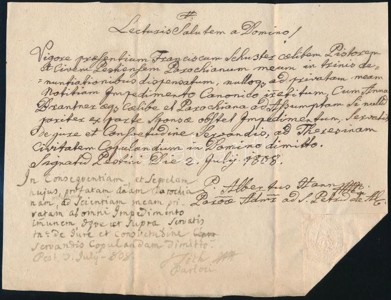 Leírás: 1808 Pest, plébániai házassági engedély, latin nyelven, felzetes viaszpecséttel