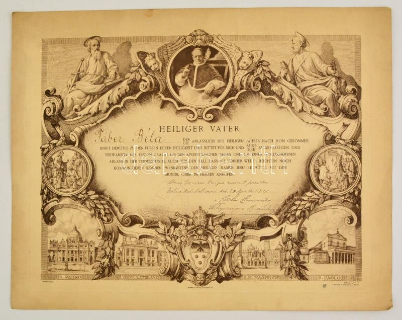 1921 Decorated Pilgrim Certificate, with papal dry seal ( "Magister Sacrarum Largitionum Pont[ifex] Max[imus]"), with the signature of Carlo Cremonesi (1866-1943) archbishop, after cardinal.