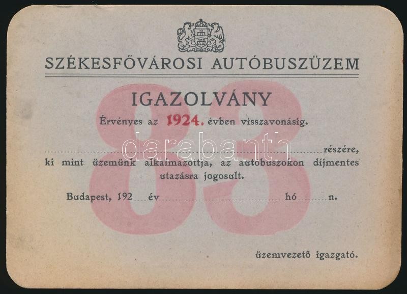 1924 Bp., Székesfővárosi autóbuszüzem által kiadott igazolvány, haszná... https://www.darabanth.com/hu/322-Gyorsarveres/322.0/Festmeny-mutargy-papirregiseg-egyeb/Okmanyok~500016/1924-Bp-Szekesfovarosi-autobuszuzem-altal-kiadott-igazolvany-hasznalatlan~II1784784