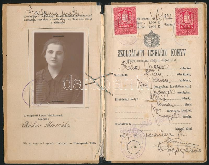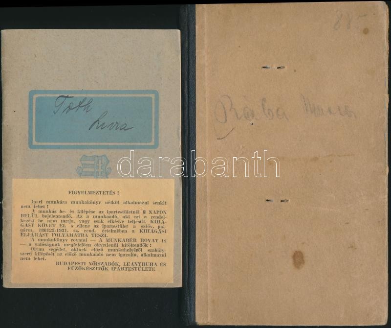 1927, 1947 Szolgálati cselédkönyv és női szabó számára kiállított munk... https://www.darabanth.com/hu/322-Gyorsarveres/322.0/Festmeny-mutargy-papirregiseg-egyeb/Okmanyok~500016/1927-1947-Szolgalati-cseledkonyv-es-noi-szabo-szamara-kiallitott-munkakonyv-okmanybely~II1788317