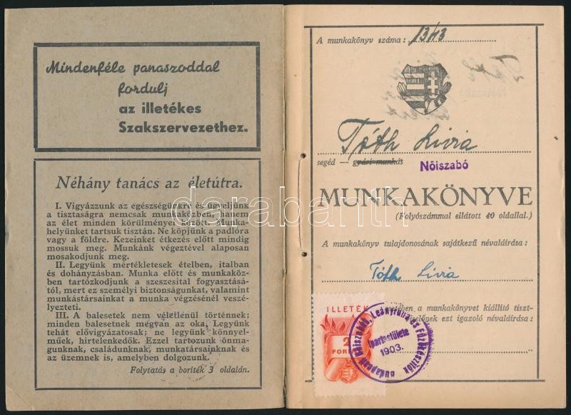 Leírás: 1927, 1947 Szolgálati cselédkönyv és női szabó számára kiállított munkakönyv okmánybélyegekkel