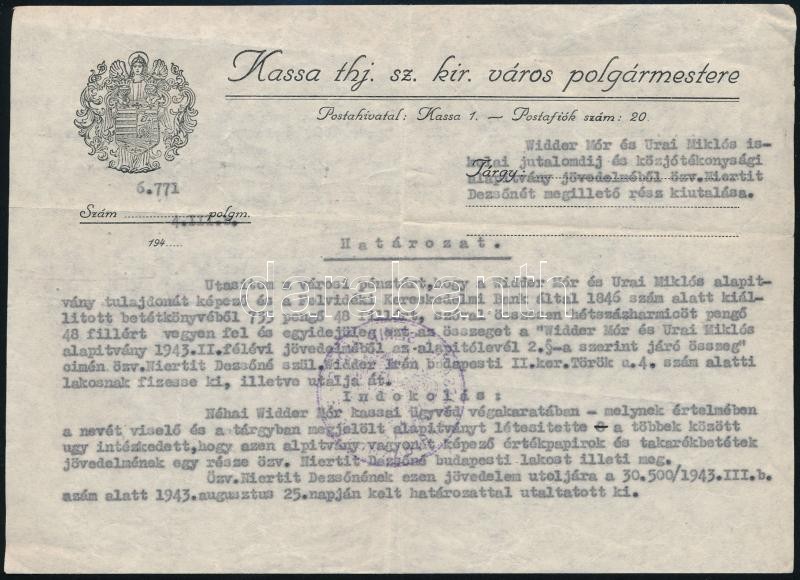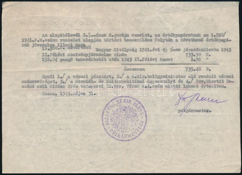 Leírás: 1944 Irat Pohl Sándor kassai polgármester aláírásával