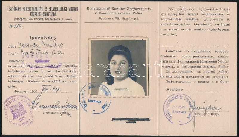 Leírás: 1945 az Építőipari Romeltakaírtási és Helyreállítási Munkák Központi Bizottsága fényképes igazolványa építőipari alkalmazott részére