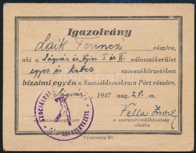 1947 Ságvár, Szociáldemokrata Párt képviselőjelöltjének igazolványa https://www.darabanth.com/hu/322-Gyorsarveres/322.0/Festmeny-mutargy-papirregiseg-egyeb/Okmanyok~500016/1947-Sagvar-Szocialdemokrata-Part-kepviselojeloltjenek-igazolvanya~II1784749