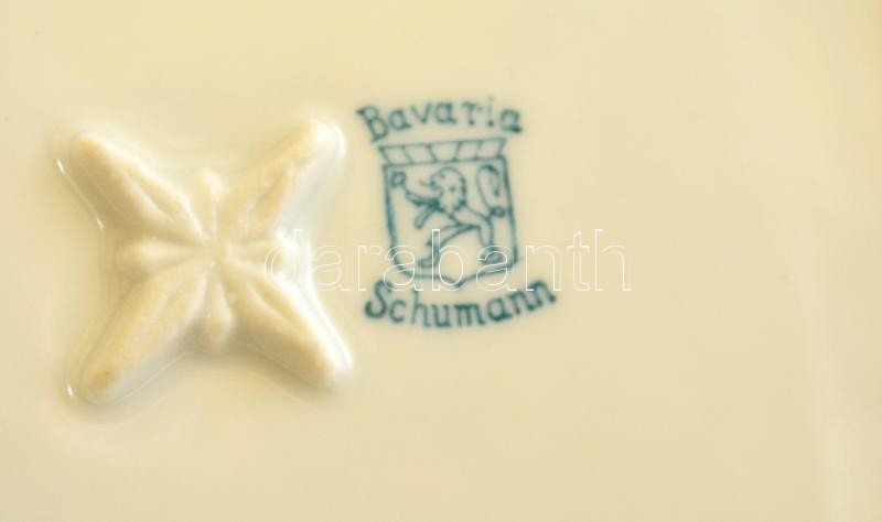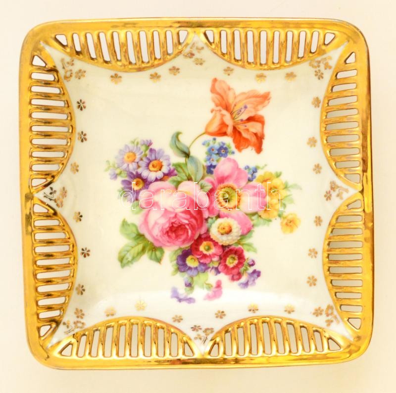 Leírás: Scumann Bavaria áttört szélű tál, matricás, jelzett, kopott, 18×18 cm