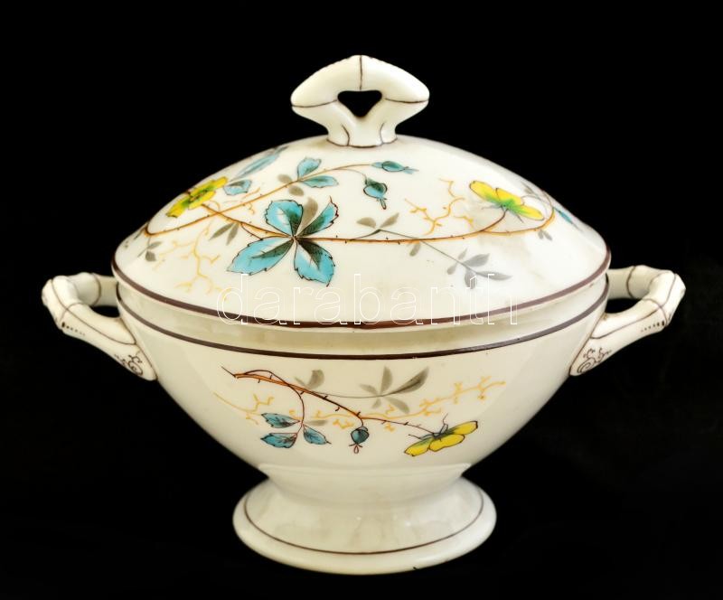 Leírás: cca 1900 szósztartó, kézzel festett, jelzés nélkül, apró karcolással, m:15 cm, 19×15 cm