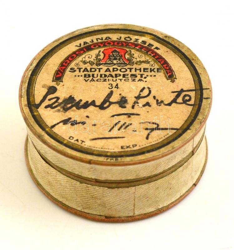 Leírás: cca 1895 Vajna József Városi Gyógyszertára Budapest Váci utca, gyógyszeres papírdobozka, d: 4,5 cm