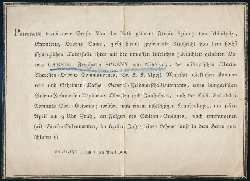 1818 Báró Splényi Gábor (1734-1818) altábornagy német nyelvű gyászjelentése, hátoldalán dédunokája, Jekelfalussy Zoltán (1862-1945) Fiume utolsó magyar kormányzójának háromsoros saját kézzel aláírt megjegyzésével