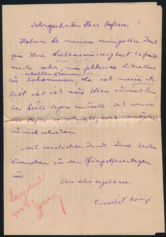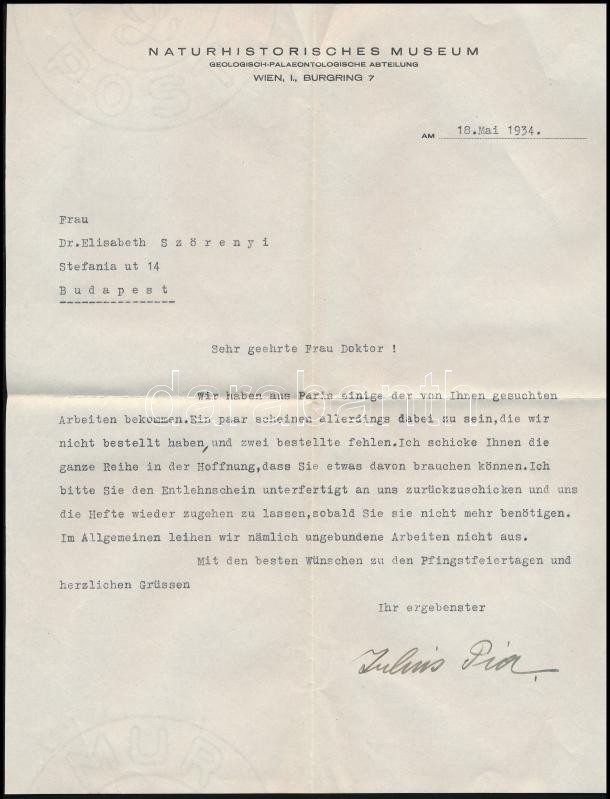 Julius von Pia (1887-1943 ) osztrák geológus, paleontológus, saját kézzel írt levelezőlapja Szörényi Erzsébet (1904-1987) geológusnak és az ő válasza / Autograph letter of Austrian geologist Julius von PIa to his Hungarian colleague. And her reply.