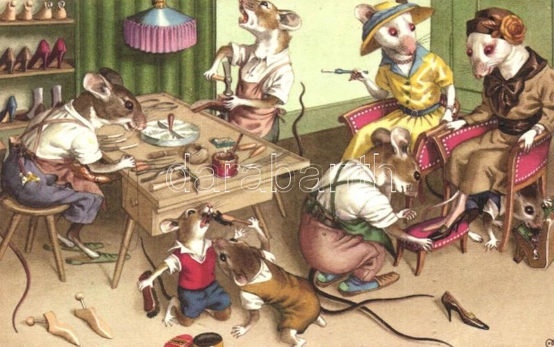 Mouse shoemakers in work. Alfred Mainzer - modern postcard (EK) https://www.darabanth.com/hu/322-Gyorsarveres/322.0/Kepeslapok/Allat~2000017/Mouse-shoemakers-in-work-Alfred-Mainzer--modern-postcard-EK~II1740657