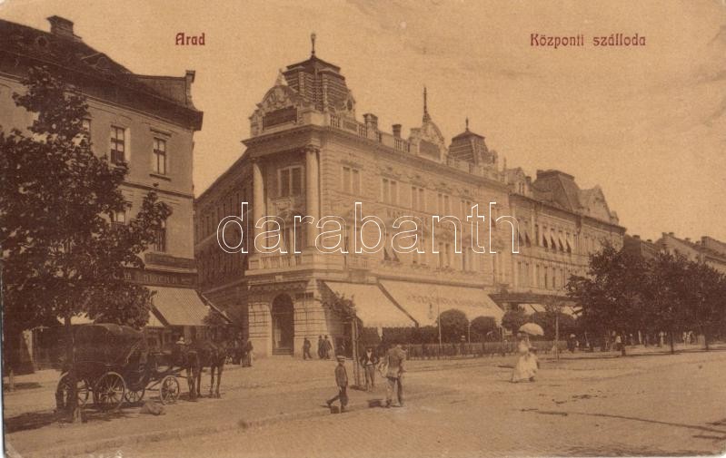 Arad, Központi szálloda és kávéház, Bloch H. üzlete, nyomda. Kiadja Kerpel Izsó / central hotel and café, shops, printing house (apró szakadás / tiny tear)