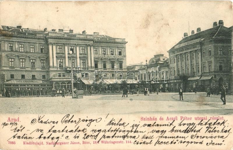 Arad, Színház, Aczél Péter utca, Michl Színházi sörcsarnoka, Nagy Lajos szállodája a Fehér Kereszthez, Szabadságharc Emléktárgyak Országos Múzeum, üzletek. Nachbargauer János kiadása / street view, theater, beer hall, inn, hotel, museum, shops (EK)