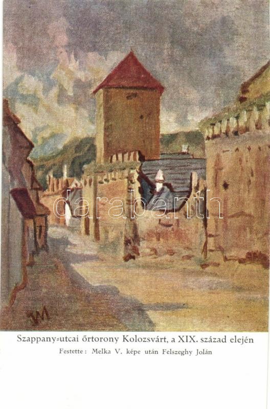 Kolozsvár, Cluj; Szappany utcai őrtorony Kolozsvárt a XIX. század elején. Vörös Kereszt segélylap. Festette Melka V. képe után Felszeghy Jolán / street view, watchtower in the 19th century. Red Cross charity card
