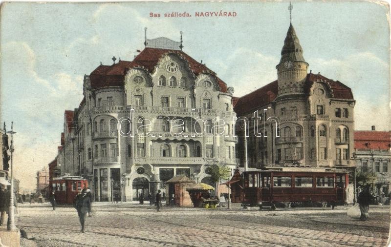 Nagyvárad, Oradea; Fekete Sas szálloda, villamos / hotel, tram (EK) https://www.darabanth.com/hu/322-Gyorsarveres/322.0/Kepeslapok/Erdely~2000007/Nagyvarad-Oradea-Fekete-Sas-szalloda-villamos-hotel-tram-EK~II1786222