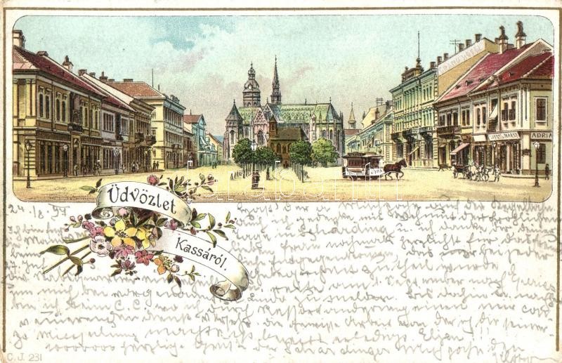 1897 (Vorläufer!) Kassa, Kosice; Fő utca, Adrianyi Marko üzlete, lóvasút. C. J. 231. / main street, shop, horse-drawn tram. Floral, Art Nouveau, litho (EK)