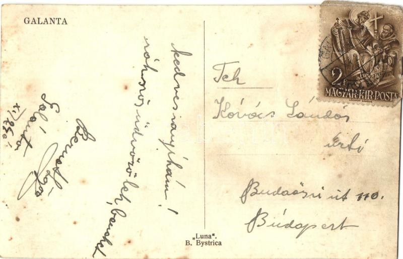 1938 Galánta, Galanta; utcakép, Stern Adolf bútorraktára, dohánybolt, Weisz M. üzlete, Szlovák Népbank / street view with shops and Slovakian bank. Foto Luna (felületi sérülés / surface damage)