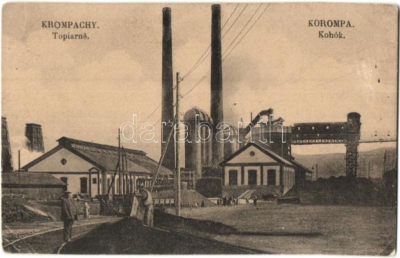 Leírás: Korompa, Krompach; Topiarne / Vasgyári kohók, iparvasút, munkások. Dall'asta János kiadása / iron works, furnace, industrial railway, factory workers (EK)