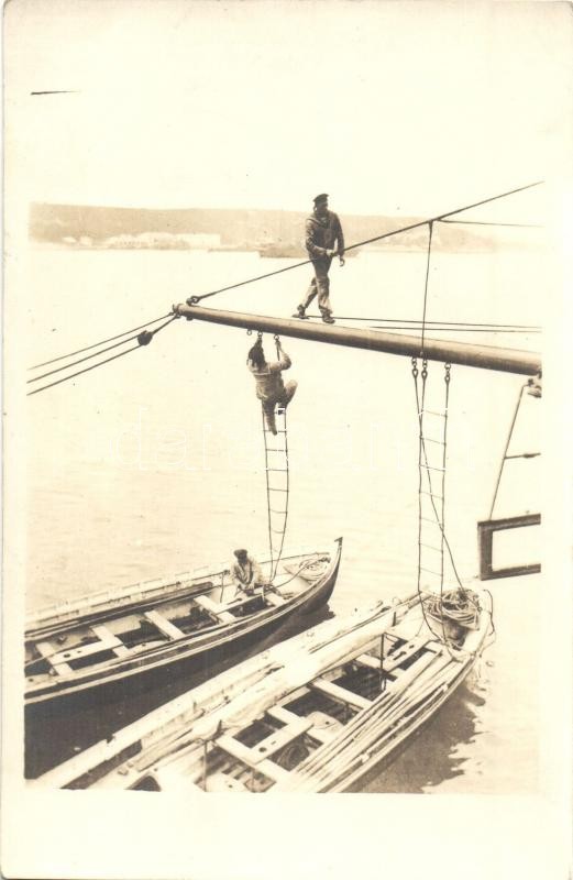 Leírás: Evezős naszádok az SMS Viribus Unitis az Osztrák-Magyar Haditengerészet Tegetthoff-osztályú csatahajója mellett, matrózok / WWI Austro-Hungarian Navy K.u.K. Kriegsmarine SMS Viribus Unitis, rowing boats with mariners. photo