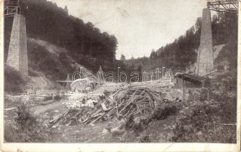 Csorbadomb, Cserbin, Shcherbyn; Karpathen des Uzsokerpasses. Gesprengte Brücke / Felrobbantott vasúti viadukt, híd az Uzsoki-szorosban. N. Kraus kiadása 1915. / blown up railway bridge by Uzhok Pass (pereval Uzsockij) (kis szakadás / small tear)