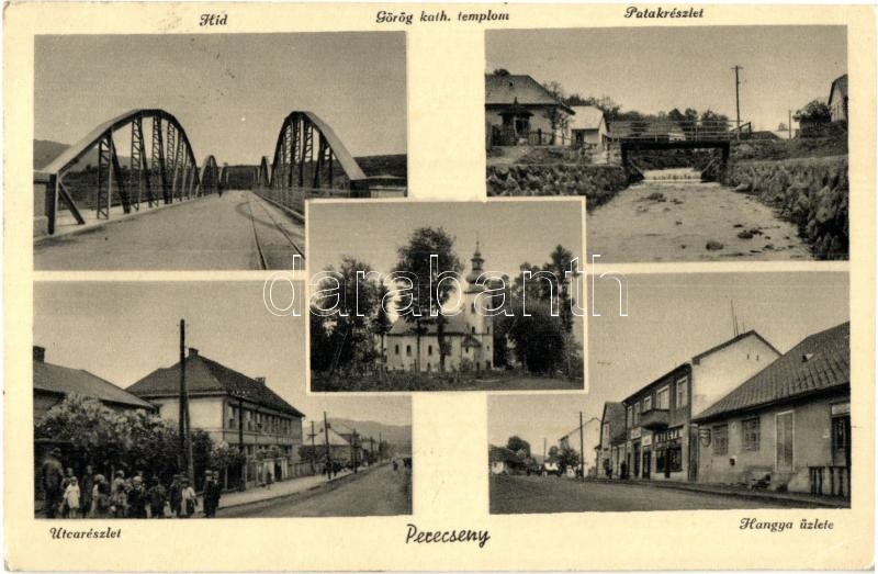 Leírás: Perecseny, Perechyn, Perecin; Híd, Görögkatolikus templom, Patak, utcakép, Hangya Szövetkezet üzlete és saját kiadása / bridge, Greek Catholic church, creek, street view, cooperative shop (EK)