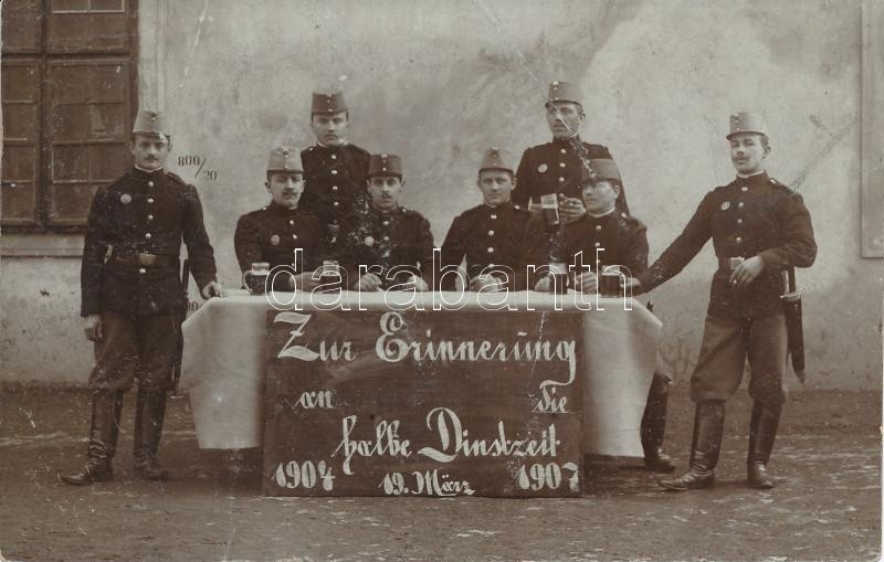 1904-1907 Zur Erinnerung an die halbe Dienstzeit / Osztrák-magyar katonák a szolgálati idő felét ünneplik sörrel / Austro-Hungarian military, soldiers celebrating half-time in their period of service with beer. photo