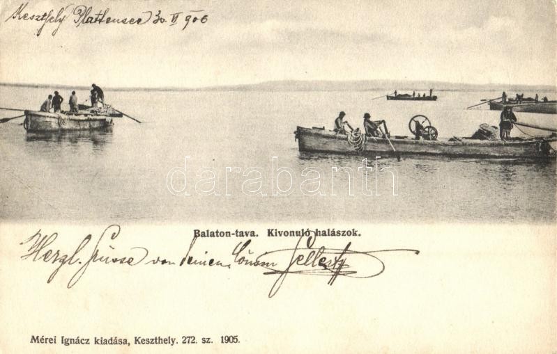 Balaton, Kivonuló halászok. Mérei Ignácz kiadása 272. sz. 1905. (EK) https://www.darabanth.com/hu/322-Gyorsarveres/322.0/Kepeslapok/Magyarorszag~2000006/Balaton-Kivonulo-halaszok-Merei-Ignacz-kiadasa-272-sz-1905-EK~II1785618