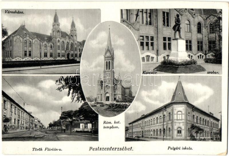 Leírás: Budapest XX. Pestszenterzsébet, Városháza, Kossuth Lajos szobor, Római katolikus templom, Polgári iskola, Török Flóris utca (vágott / cut)