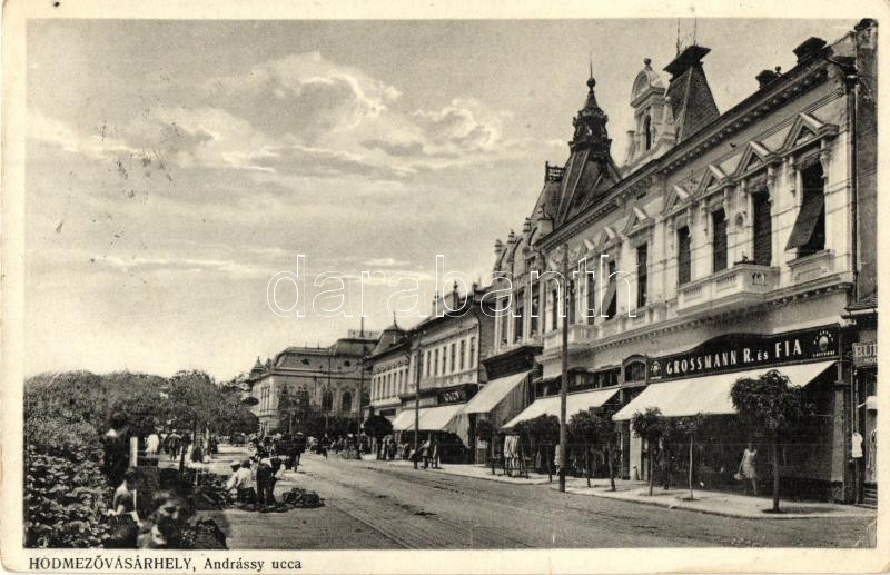 Hódmezővásárhely, Andrássy utca, Grossmann R. és Fia üzlete, piac (EK) https://www.darabanth.com/hu/322-Gyorsarveres/322.0/Kepeslapok/Magyarorszag~2000006/Hodmezovasarhely-Andrassy-utca-Grossmann-R-es-Fia-uzlete-piac-EK~II1787267