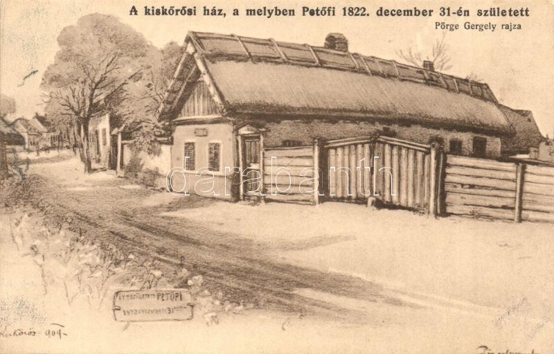 Leírás: Kiskőrös, A kiskőrösi ház, amelyben Petőfi 1822. december 31-én született, Petőfi szülőháza. Pörge Gergely rajza