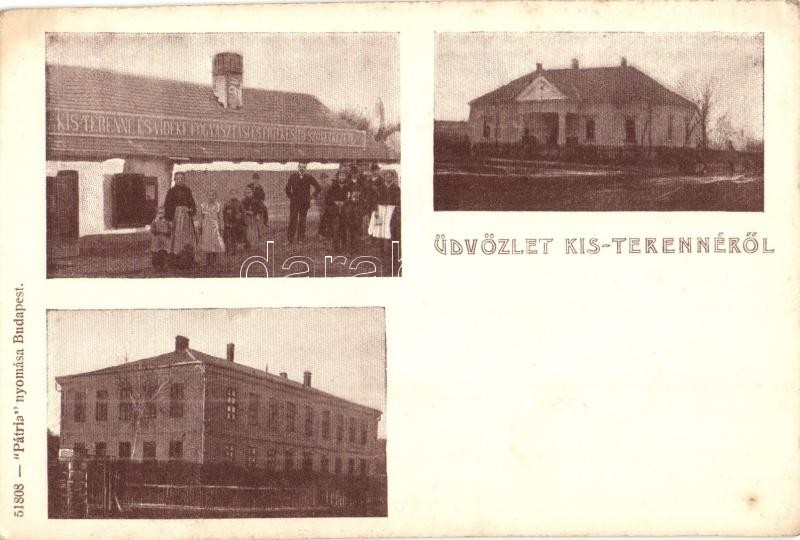 Leírás: Kisterenye, Kis-Terenne (Bátonyterenye); Kisterenye és Vidéke Fogyasztási Szövetkezet üzlete, kastély, kúria. Pátria nyomása (EK)
