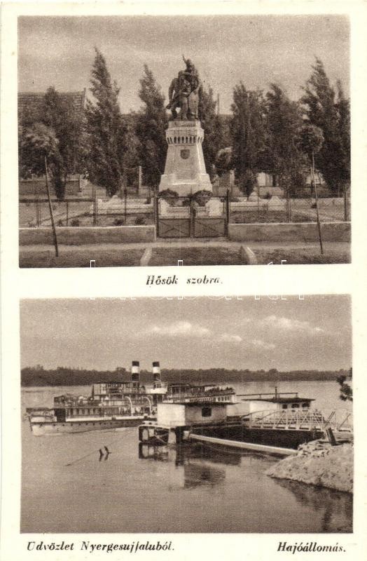 Leírás: Nyergesújfalu, Hősök szobra, Hajóállomás, gőzhajó. Siklósi Pál kiadása