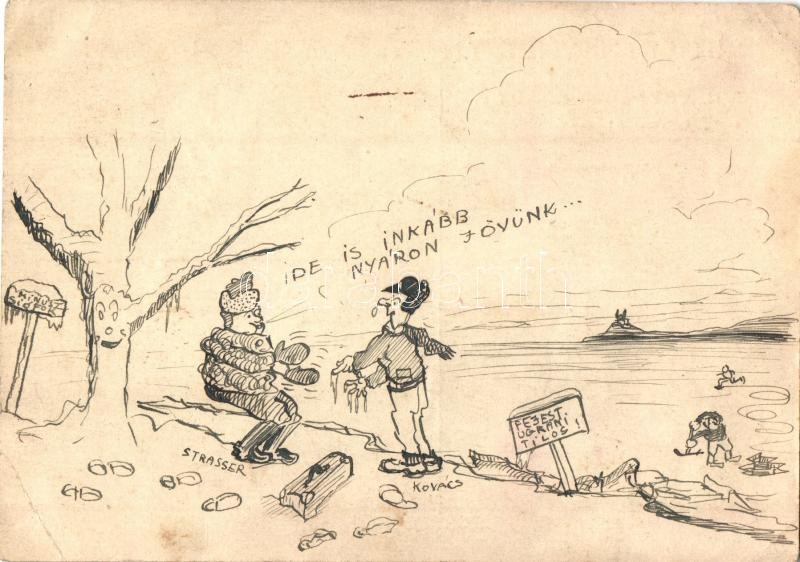 Siófok, Ide is inkább nyáron jövünk.... Humoros, grafikus, kézzel rajz... https://www.darabanth.com/hu/322-Gyorsarveres/322.0/Kepeslapok/Magyarorszag~2000006/Siofok-Ide-is-inkabb-nyaron-jovunk-Humoros-grafikus-kezzel-rajzolt-lap-Hutter-es-Lever~II1787501