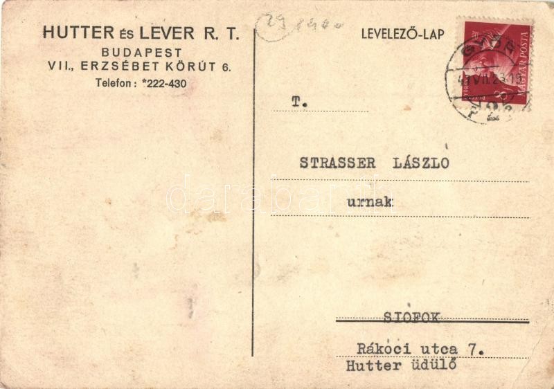 Leírás: Siófok, Ide is inkább nyáron jövünk.... Humoros, grafikus, kézzel rajzolt lap Hutter és Lever rt. reklámmal a hátoldalon (EK)